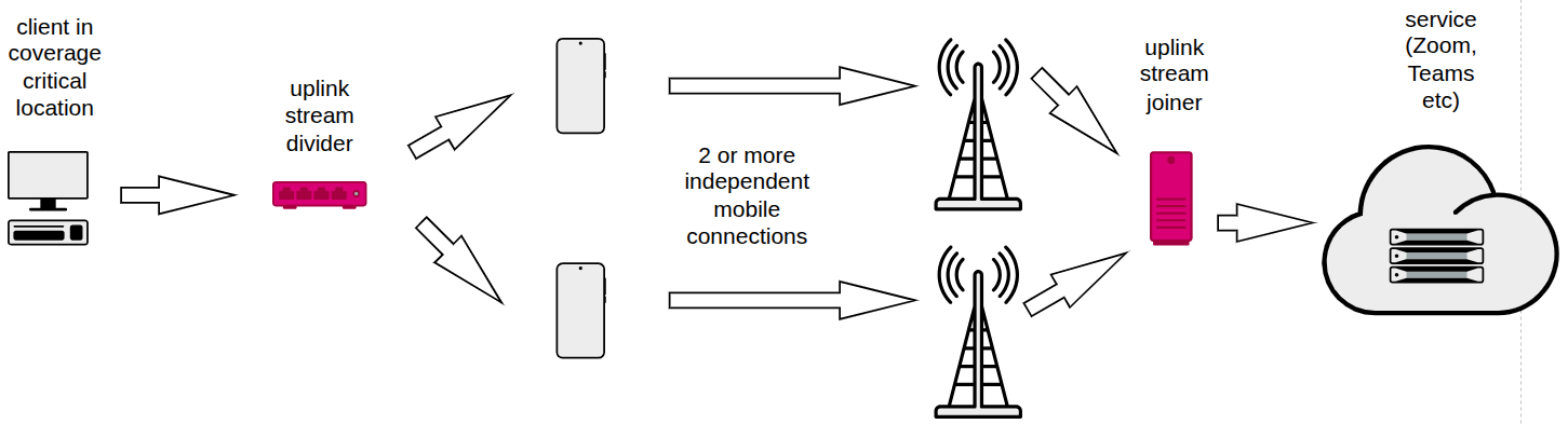 DuoRay proposes a two-end system with a flow divider/mirrorer at the client’s end and an aggregator on a fixed internet (or cloud) end that will significantly increase connection stability because of the independence of two (or more) mobile channels.